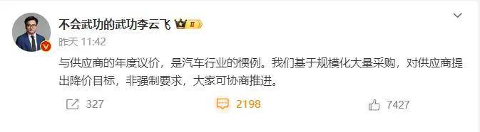 比亞迪品牌及公關(guān)處總經(jīng)理李云飛在微博上對此作出了回應(yīng),他指出,與供應(yīng)商的年度議價是汽車行業(yè)的常規(guī)操作。比亞迪基于規(guī)模化大量采購的優(yōu)勢,對供應(yīng)商提出降價目標,但這并非強制要求,而是可以協(xié)商推進的。