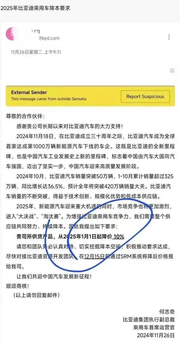2024年11月26日晚間,一封涉及比亞迪集團內(nèi)部決策的郵件在業(yè)界引起了廣泛討論。該郵件的主題為《2025年比亞迪乘用車降本要求》,內(nèi)容指出比亞迪集團要求供應(yīng)商從2025年1月1日起對其供貨產(chǎn)品降價10%,郵件的署名者則是比亞迪集團執(zhí)行副總裁兼乘用車COO何志奇。
