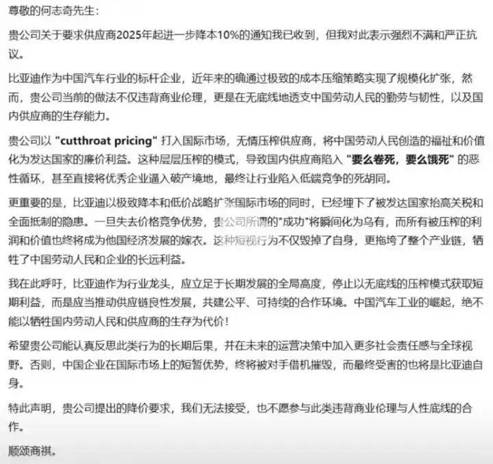 這封郵件的曝光引發(fā)了公眾的熱議,同時這家經(jīng)銷商也給出了十分強硬的態(tài)度,并寫到“比亞迪作為中國汽車行業(yè)的標桿企業(yè),近年來的確通過極致的成本壓縮策略實現(xiàn)了規(guī)?;瘮U張。然而,公司當前的做法不僅違背商業(yè)倫理,更是在無底線地透支中國勞動人民的勤勞與韌性,以及國內(nèi)供應(yīng)商的生存能力。”甚至更把這次要求供應(yīng)商降價上升到更高的層面,表示“比亞迪無情壓榨供應(yīng)商,將中國勞動人民創(chuàng)造的福祉和價值化為發(fā)達國家的廉價利益。這種層層壓榨的模式,導(dǎo)致國內(nèi)供應(yīng)商陷入‘要么卷死,要么餓死’的惡性循環(huán),甚至直接將優(yōu)秀企業(yè)逼入破產(chǎn)境地,最終讓行業(yè)陷入低端競爭的死胡同。”