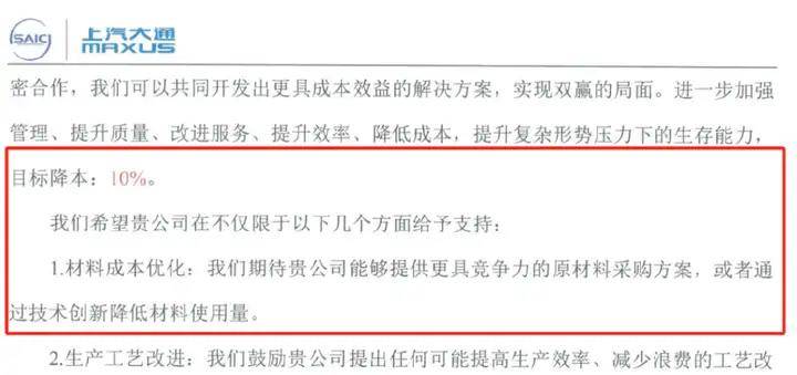 無獨有偶,隨后一份上汽大通汽車有限公司的文件也被曝出,該文件顯示上汽大通也向其供應(yīng)商發(fā)出了類似的降價要求。上汽大通在文件中提到,當前汽車市場供大于求的問題十分突出,新車大量上市導(dǎo)致市場供需失衡的狀況在短期內(nèi)難以得到根本改善,價格戰(zhàn)難以平息。上汽大通認為“卷成本”將是2025年汽車行業(yè)的主旋律,并誠摯邀請供應(yīng)商伙伴共同參與到成本控制的大項目中。上汽大通希望通過雙方的緊密合作,共同開發(fā)出更具成本效益的解決方案,實現(xiàn)雙贏的局面。上汽大通強調(diào),通過加強管理、提升質(zhì)量、改進服務(wù)、提升效率、降低成本,可以提升在復(fù)雜形勢下的生存能力,目標降本為10%。