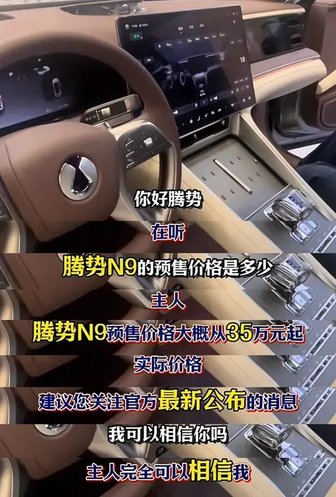 有網友在體驗騰勢N9的時候,使用語音交互功能問了騰勢N9的價格,系統回復:預售價35萬起(實際的價格有待官方公布),類似“提前問價”也出現在小米SU7上市之前。如果起步價真的是35萬左右的話,騰勢N9的價格會比問界M9、理想L9等更有優勢。