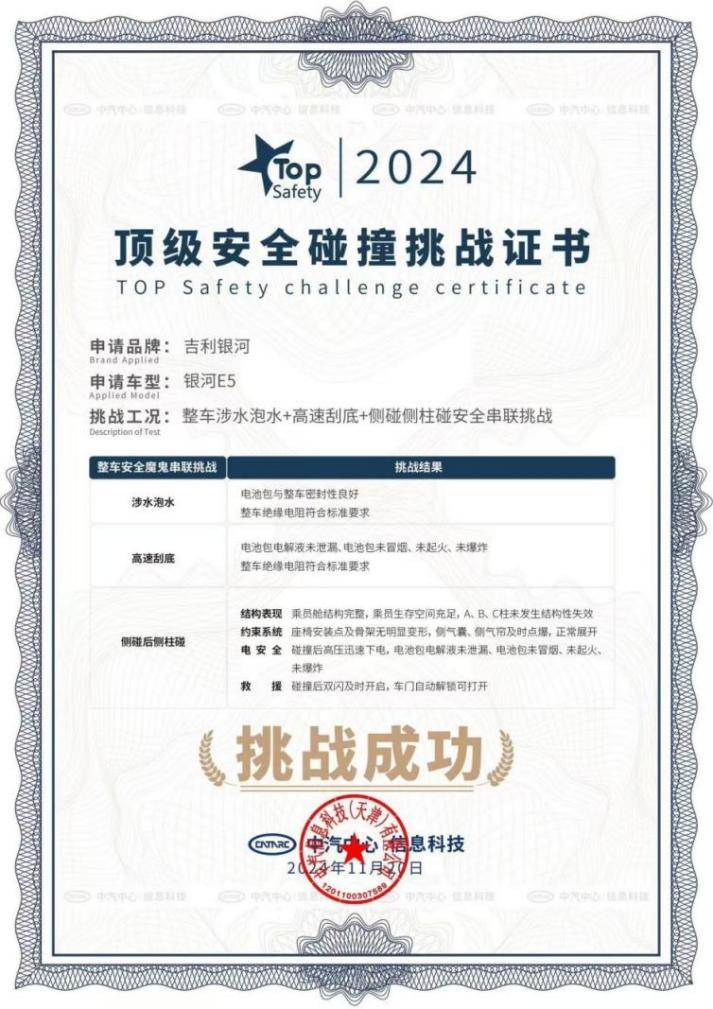 在多方見證下,吉利銀河E5順利通過此次全面超越國標標準、模擬用戶真實用車極端環境的串聯試煉,并獲頒TOP Safety中國汽車頂級安全碰撞挑戰證書,鑄就10萬級純電安全最高標準。在官宣上市119天交付量超6萬輛不久,吉利銀河E5順利通過串聯試煉,無疑在向用戶釋放其是10萬級最安全純電SUV的信號,將激發“銀河速度”新一輪提升動能。