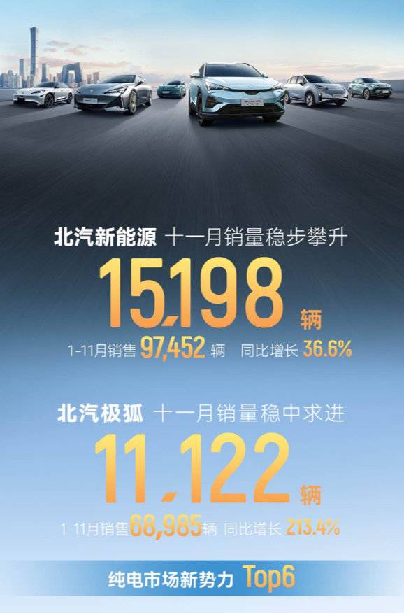 特斯拉作為曾經(jīng)的領(lǐng)頭羊,近期銷量明顯下滑,10月銷量降幅超40%。與此同時(shí),自主品牌新能源汽車表現(xiàn)強(qiáng)勁,市場(chǎng)份額增長(zhǎng)至77%。在自主品牌中,北汽極狐的增速尤為顯著。從2月的銷量不足千輛,到6月突破八千,再到8月起連續(xù)破萬, 11月,極狐穩(wěn)中求進(jìn),銷量11122輛,位居純電市場(chǎng)新勢(shì)力TOP6。