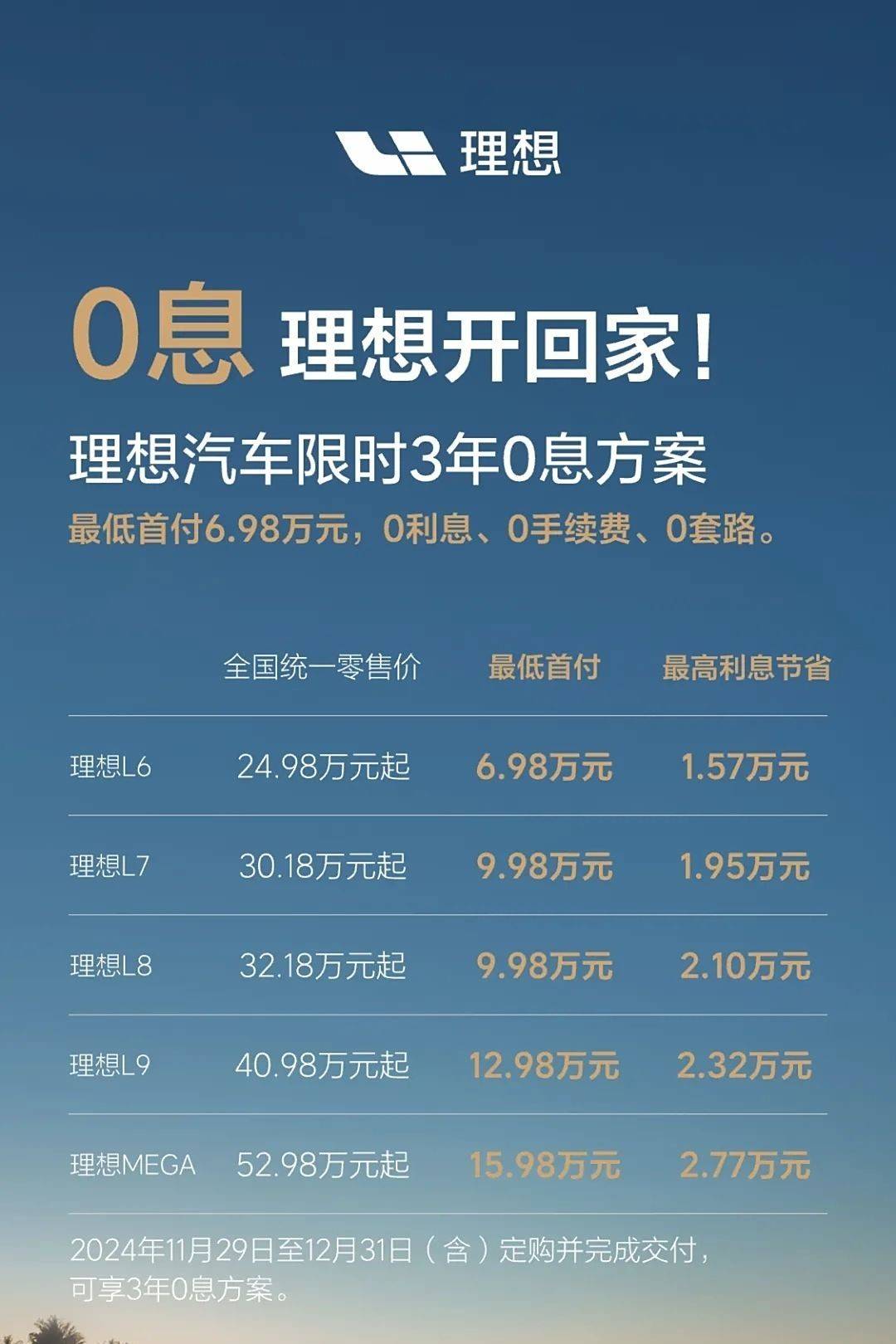 還沒進入12月,理想率先拿出了3年0息的購車方案。從11月29日起到12月31日定購并且完成交付的用戶,可以享受3年0息的購車方案。這套方案覆蓋目前理想的所有車型,能夠為用戶節省1.57-2.77萬元的利息。