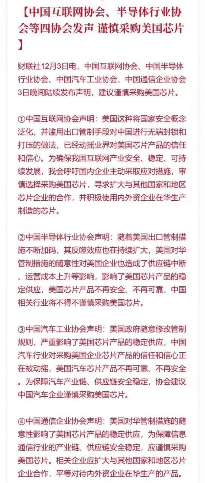 12月3日,我國的互聯(lián)網(wǎng)協(xié)會、汽車工業(yè)協(xié)會、半導(dǎo)體行業(yè)協(xié)會、通信企業(yè)協(xié)會四大協(xié)會罕見同步發(fā)聲,呼吁警惕美國芯片。其中中國汽車工業(yè)協(xié)會的聲明指出,美國芯片產(chǎn)品的供應(yīng)變得不再穩(wěn)定,建議中國汽車企業(yè)謹(jǐn)慎采購。