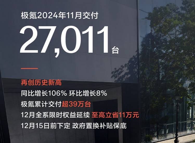 極氪11月份交付新車27011臺,同比大漲106%,環(huán)比增長8%,目前品牌已累計(jì)交付新車39萬臺。極氪此前推出的大都是一些小眾化的細(xì)分車型,隨著去年年底極氪007以及今年極氪7X這兩款大眾化的車型上市,銷量有著顯著提升。
