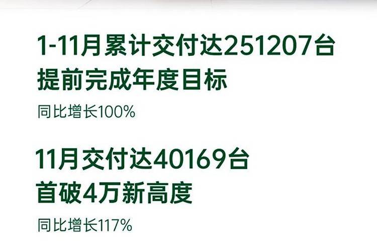 鴻蒙智行11月份交付新車41931輛,連續(xù)兩個月銷量突破4萬。其中,問界M7系列11月交付12573輛,智界R7 11月交付8983輛,尊界S800上市48小時預(yù)定2108臺。問界M9發(fā)布11個月累計(jì)大定突破18萬輛,連續(xù)蟬聯(lián)中國市場50萬以上月度銷冠;享界S9上市以來連續(xù)蟬聯(lián)40萬以上純電轎車銷量第一。