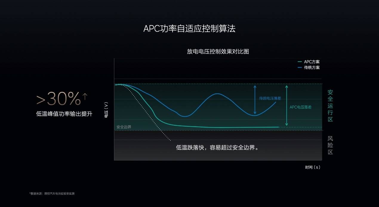 針對增程車型,理想汽車還開發了APC功率控制算法,以提升電池的低溫放電能力。這一算法通過高精度的電池電壓預測模型,實現了未來工況電池最大能力的毫秒級預測,從而可以在安全邊界內最大限度地釋放動力。憑借APC算法,理想L6在低溫環境下的電池峰值功率提升30%以上,增程器啟動前的放電電量提升了12%以上,進一步提升了冬季的純電續航。