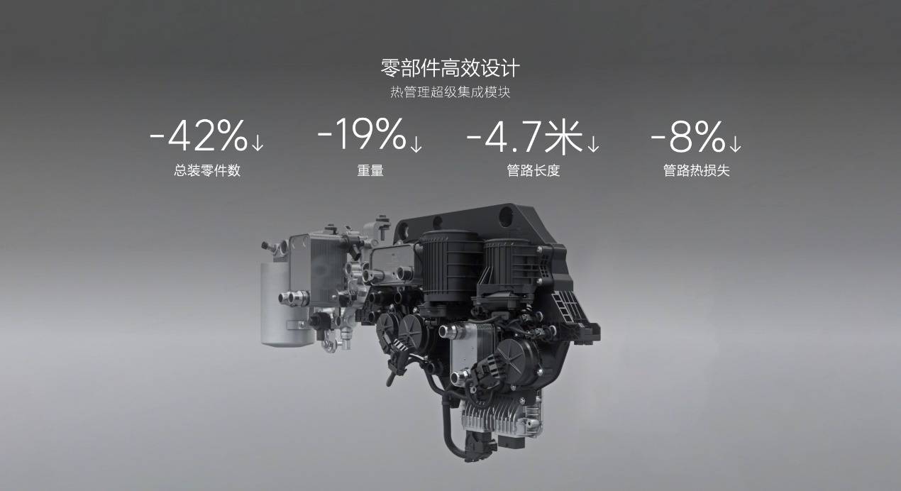 此外,理想汽車還對熱管理系統的零部件進行了高效設計,減少熱耗散。理想MEGA的熱管理集成模塊集成了泵、閥、換熱器等16個主要功能部件,大幅減少零部件數量,管路長度減少4.7米,管路熱損失減少8%。這一模塊也是行業首款滿足5C超充功能的集成模塊。理想L6則搭載了行業首款增程熱泵系統的超級集成模塊,解決了空間布置難題,實現了增程車型從0到1的突破。
