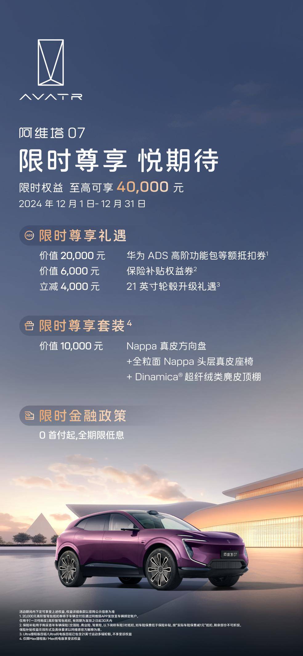 在眾多新勢力品牌中,阿維塔以獨特的優勢脫穎而出。以阿維塔07為例,它帶來了六大限時政策,其中包含首任車主終身三電質保,確保用戶無后顧之憂;內飾豪華升級禮遇讓座艙更加精致;20,000元ADS高階功能包等額抵扣券使先進技術觸手可及;金融購車限時政策更是提供了0首付起的選擇,低息貸款減輕了消費者的經濟負擔;8,000元置換現金補貼則為想要更換座駕的老車主們提供了一筆不小的實惠。此外,阿維塔還贈送了價值6,000元的保險補貼,充分展示了品牌對客戶的重視與承諾。