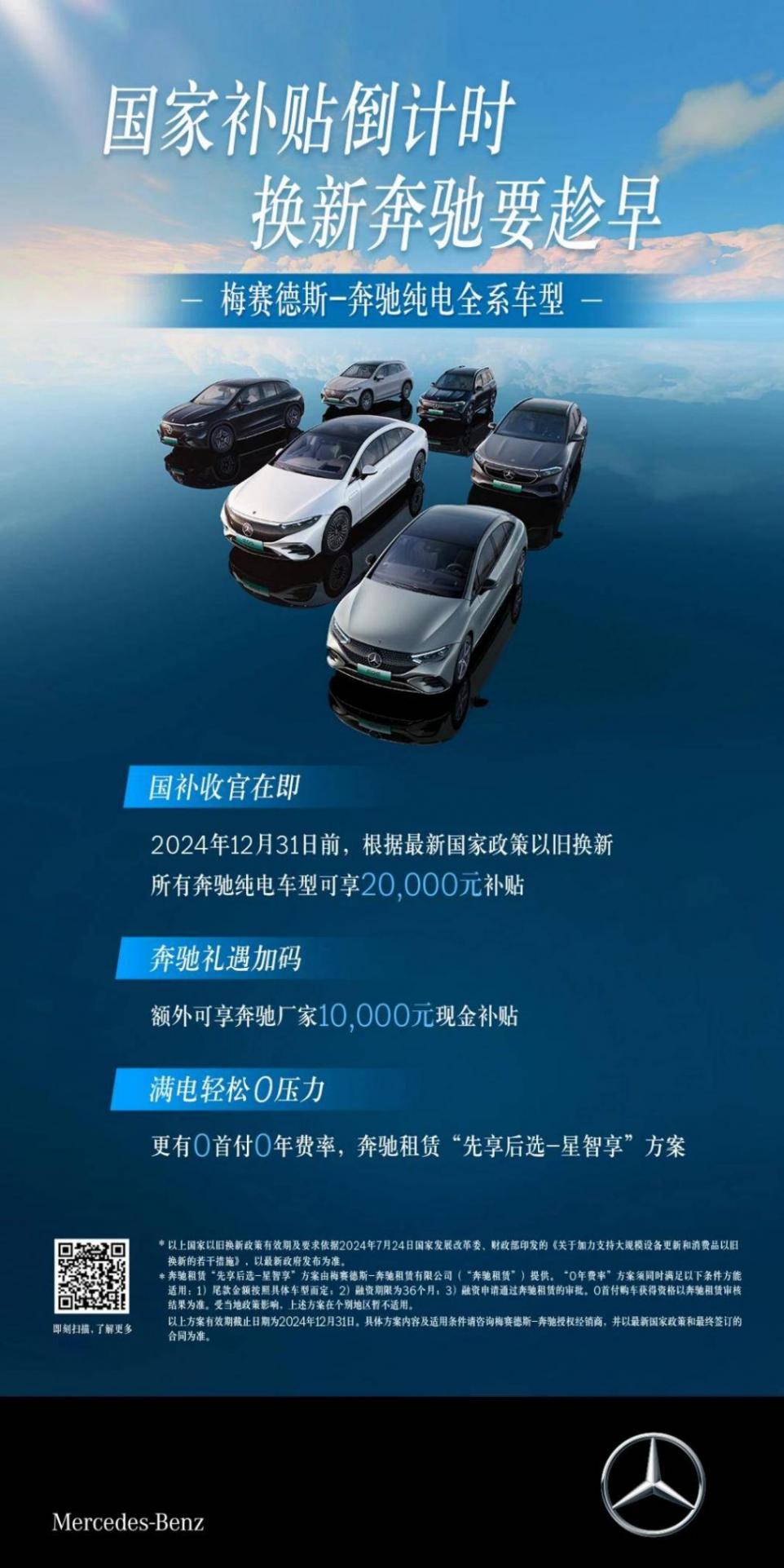 奔馳方面,在2024年12月31日前同樣享受最新國家政策進行以舊換新,以及不同金額的保險補貼或金融貸款方案。
