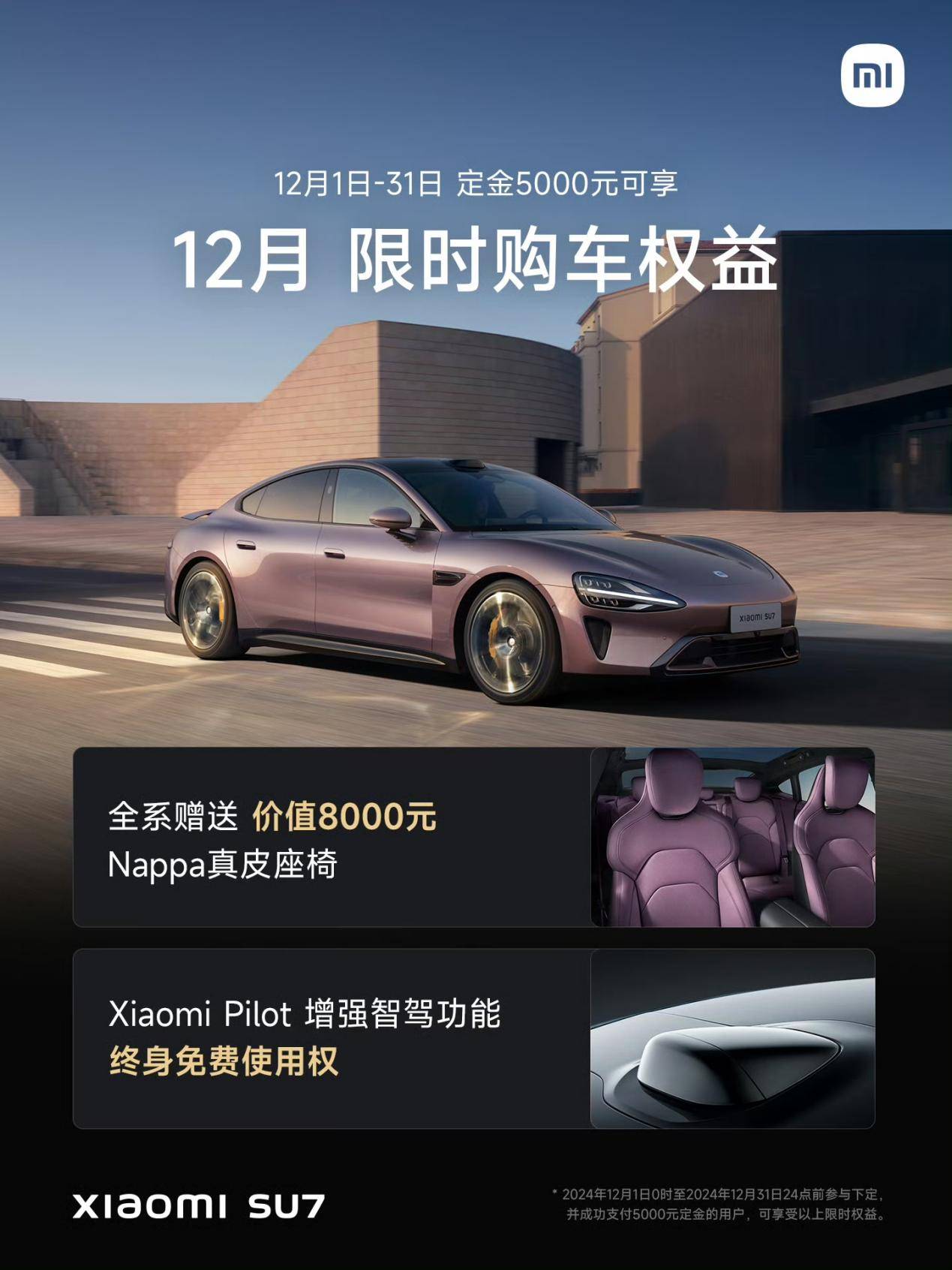 與此同時,小米SU7在12月期間為下定全系車型的客戶提供贈送價值8,000元的Nappa真皮座椅,并且小米智能駕駛增強智駕功能終身免費使用,進一步提升了車輛的科技感與舒適度。