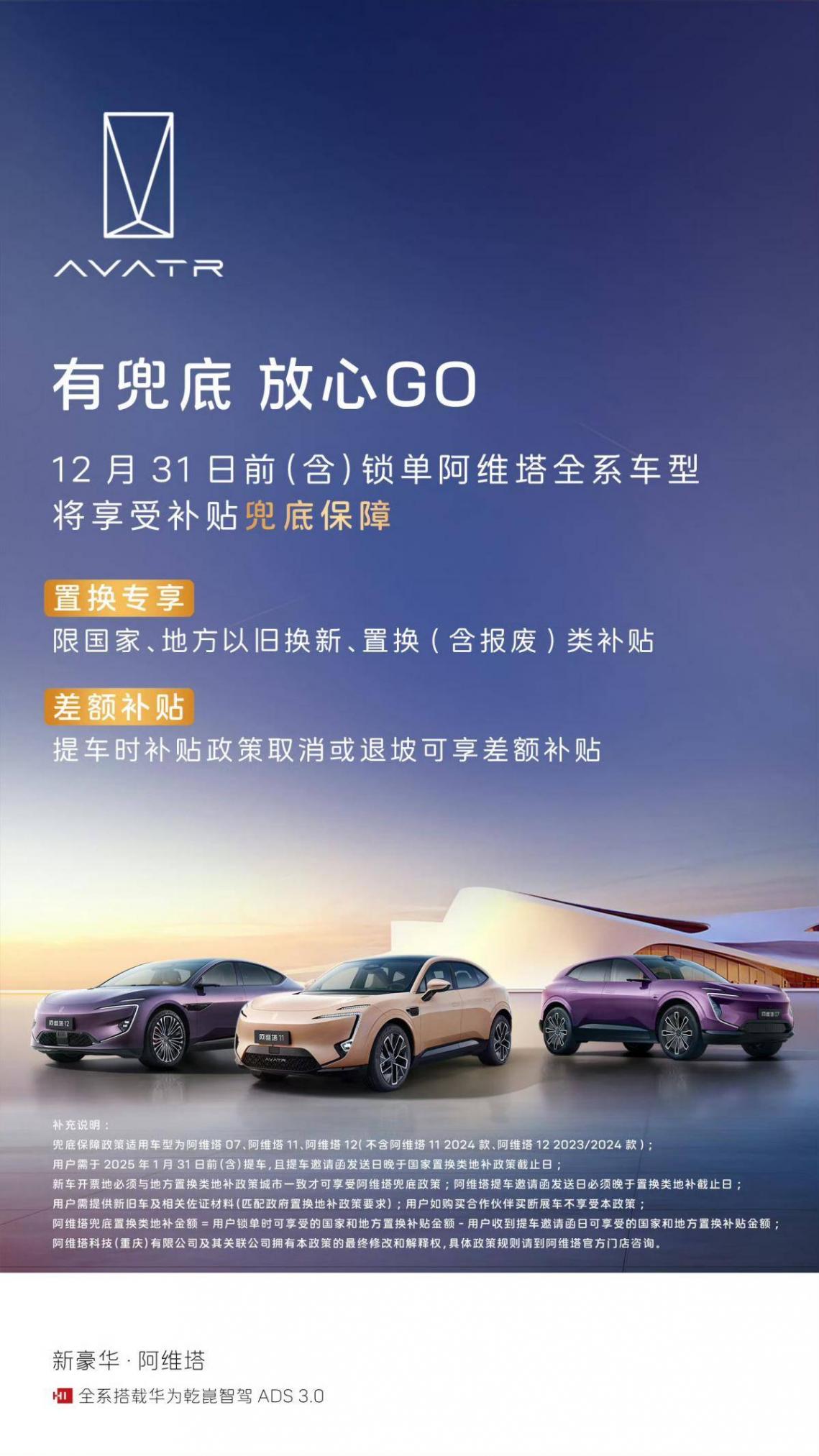 為了解決用戶對錯過補貼窗口的擔憂,阿維塔在以上提到的常規優惠政策之外,還額外推出了補貼兜底保障政策,涵蓋了2024年12月31日前(含)鎖單,并且在2025年1月31日前(含)提車的阿維塔11新款、阿維塔12新款及阿維塔07車型用戶。如果由于提車邀請函發送日晚于國家置換類地補政策截止日,導致用戶原本可以享受的國家以舊換新和地方置換補貼被取消或或比鎖單時有退坡,阿維塔將對這部分損失進行兜底,給予用戶差額補償。換句話說,阿維塔將根據用戶鎖單時可享受的國家和地方置換補貼金額,減去用戶收到提車邀請函日實際可享受的補貼金額,給予差額補償。這種兜底機制確保了即使外部政策發生變化,用戶的實際購車成本也不會因此增加。