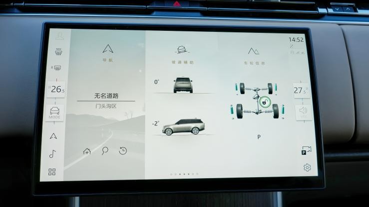 而在中控屏部分,不論選擇白天還是夜間效果,界面背景的色澤都會給人很高的視覺舒適感,除地圖、媒體等基礎信息外,其還能顯示傳動系統(tǒng)信息、車輛所處地面坡度等實時信息,取消實體按鍵雖然在之前有所爭議,但在實際上,配合觸感反饋等并不會有太大的問題。