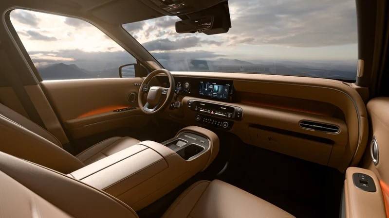 座椅也是很有意思的地方,通過前排內飾圖我們也能夠看到,前排配備了3個座椅,其中中控臺往后的區域則是中間座椅的靠背,只不過圖片里顯示的是中間座椅正處于放倒狀態,如果將其給拉起來,下面則是可以選裝一個坐人的座椅,不得不說,這腦洞還是挺大的。