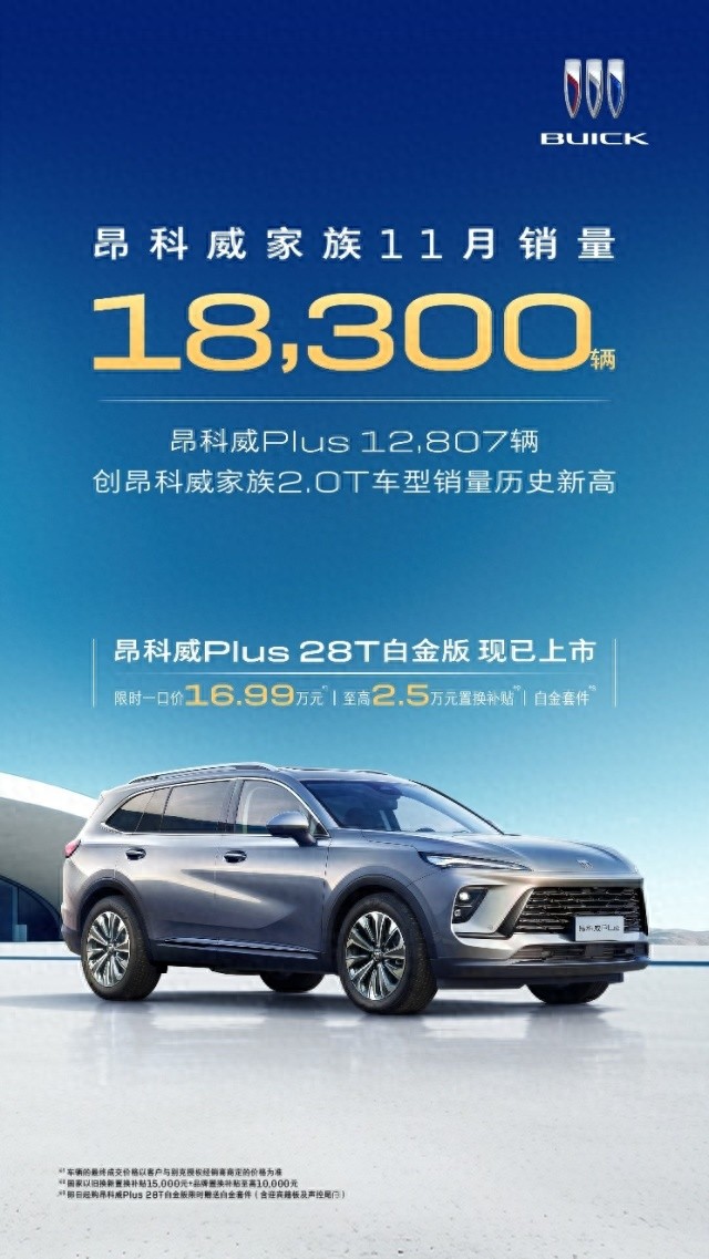 最新數據顯示,別克昂科威家族11月銷量達18,300輛。其中,昂科威Plus 當月銷量12,807輛,不僅環比增長57.1%、同比激漲110.6%,連續兩個月銷量同比翻倍,并開創了單一排量車型月銷量歷史新高,成為名副其實的市場“爆款”