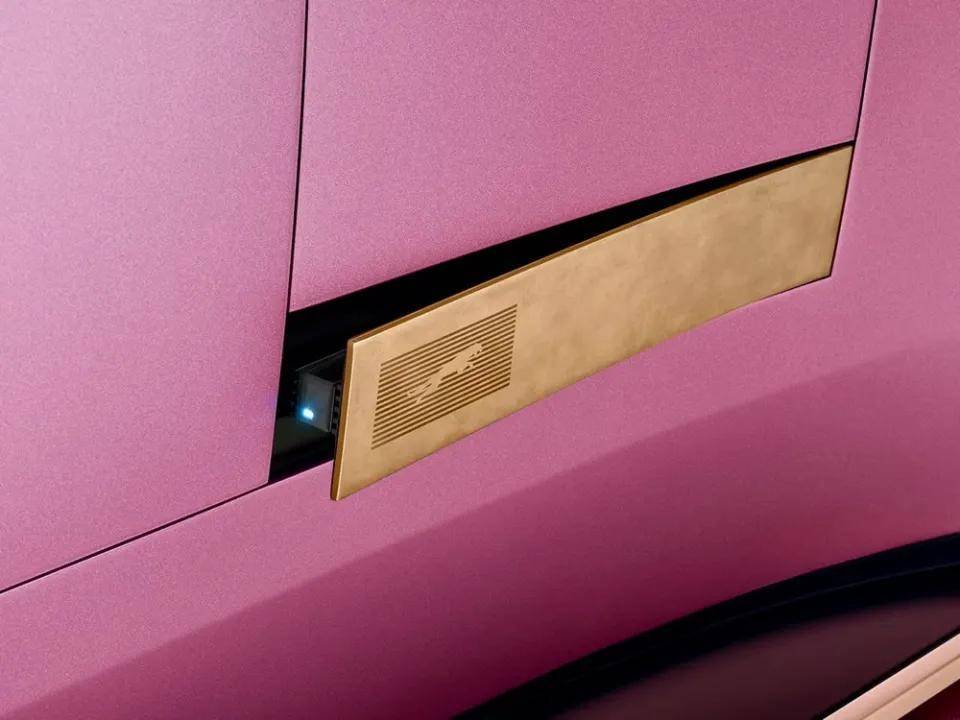 概念車的車頂使用了當下流行的一體式玻璃,但沒有后窗,類似的設計已經在Polestar 4、阿維塔12等車型上投入生產。在汽車的側面,一塊手工打造的黃銅錠上刻著“豹躍圖騰”,這些黃銅錠隱藏了后置攝像頭。