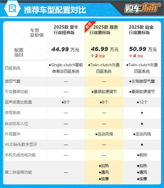 綜合比較配置來看,中配車型尊貴行政黑標(biāo)版更值得推薦。推薦車型在入門車型的基礎(chǔ)上,針對(duì)第二排座椅進(jìn)行了升級(jí),增加了加熱、通風(fēng)和按摩功能,大幅提升了第二排乘客的乘坐舒適性。除此之外,推薦車型還升級(jí)為Twin-clutch矢量四驅(qū)系統(tǒng),可實(shí)現(xiàn)更精準(zhǔn)的轉(zhuǎn)向和更穩(wěn)定的操控,并支持懸架軟硬調(diào)節(jié),提供更加舒適的駕乘體驗(yàn)。售價(jià)方面,推薦車型僅比入門車型高出了2萬元,可謂物有所值。