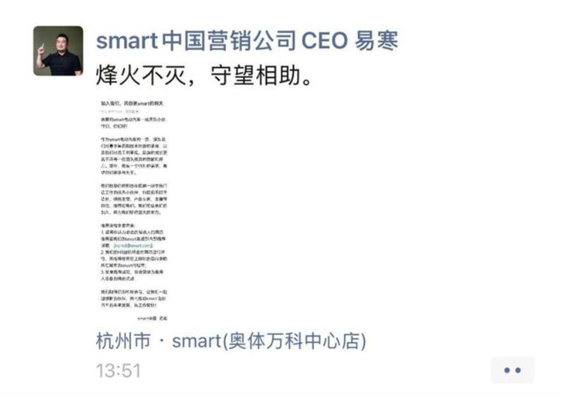 日前,smart中國營銷公司CEO易寒在其個人社交平臺隔空喊話,稱希望邀請極越一線零售門店員工加入smart中國,并配文“烽火不滅,守望相助”。易寒的這一番表態將smart品牌拉到聚光燈下,極越的“暴雷”事件是12月行業中最大的熱點之一,車主、員工、供應商以及股東成為事件中幾大受害方。