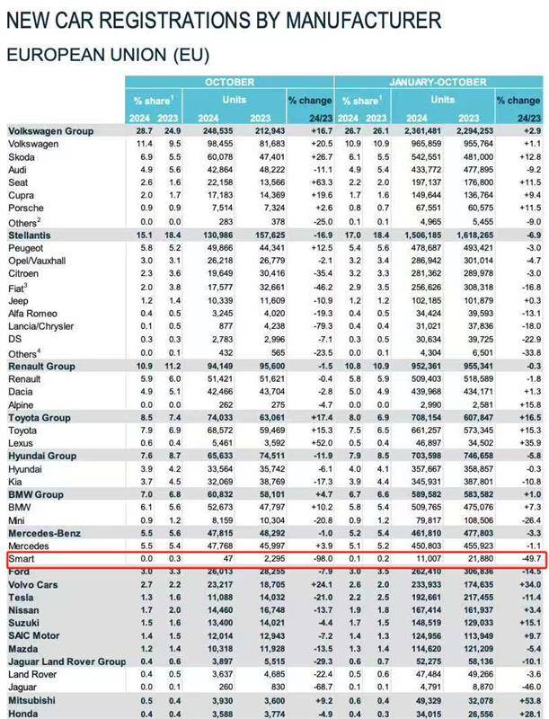 而今年下半年以來,smart的歐洲攻勢已經近乎停滯,歐洲汽車工業協會(ACEA)數據顯示,10月,smart歐洲銷量47輛、同比暴跌98%。此前的6-9月,smart歐洲銷量分別為1731輛、76輛、36輛、40輛。前1-10月,smart歐洲銷量1.1萬輛,比去年的2.18萬輛,同比暴跌49.7%近乎腰斬。