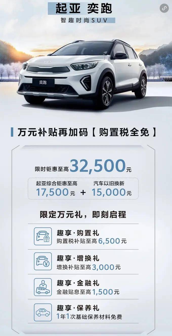 而價(jià)格最便宜的小型SUV起亞奕跑,則是給出了一個(gè)限時(shí)鉅惠至高3.25萬元的優(yōu)惠力度(含起亞綜合鉅惠1.75萬+以舊換新1.5萬)。就以自動(dòng)擋最低配車型為例,新車優(yōu)惠完之后的裸車價(jià)僅為4.73萬元,那花不到5萬的價(jià)格就買臺(tái)合資小型SUV,奕跑在12月份的銷量是否要往上漲了。