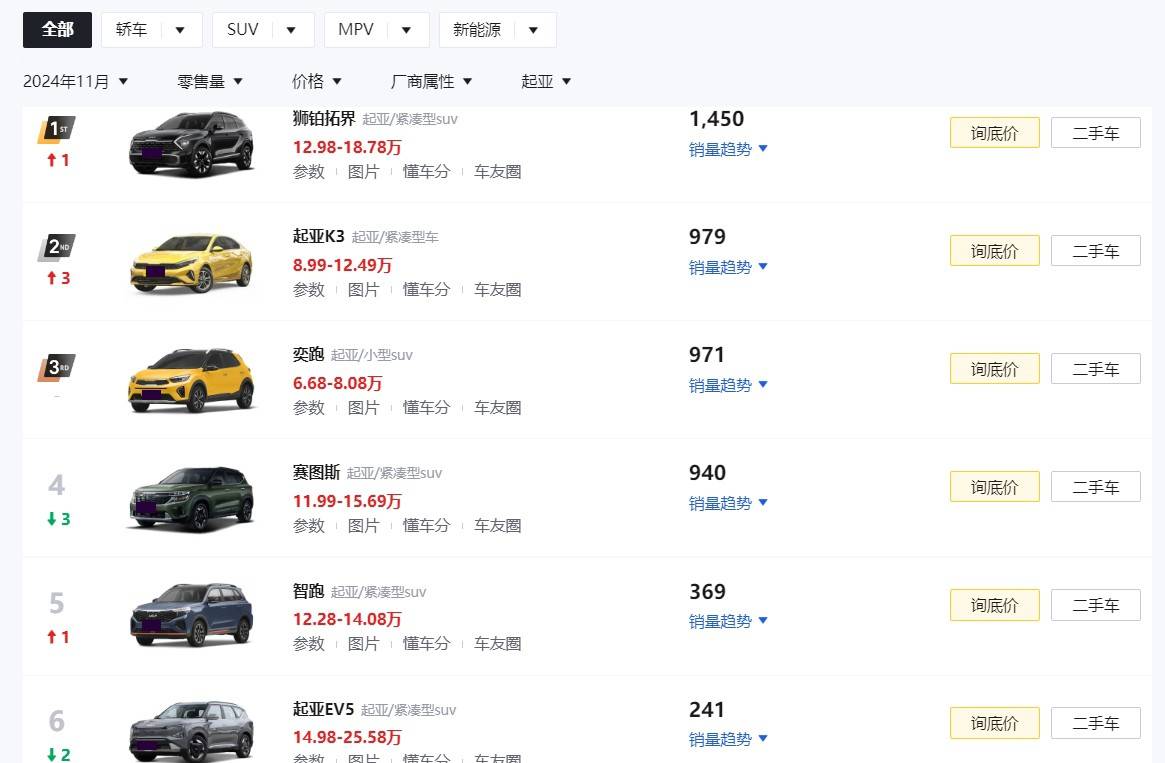 要知道,在過去的11月份,即使是起亞旗下最暢銷的車型獅鉑拓界,其也僅賣出去了1450輛新車。而除此之外,分列第二三四名的K3、奕跑、賽圖斯在11月份甚至都只有900多輛的銷量數(shù)據(jù)表現(xiàn),這顯然是不符合廠家心理預(yù)期的。