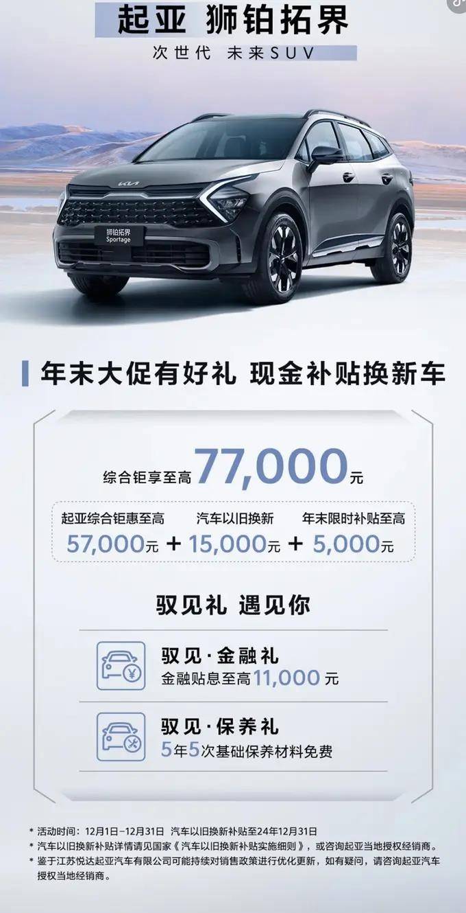 至于其它車型方面,起亞獅鉑拓界官方售價(jià)17.98萬元起,綜合鉅惠至高5.7萬元,以舊換新補(bǔ)貼1.5萬元,年末顯示補(bǔ)貼至高0.5萬元。