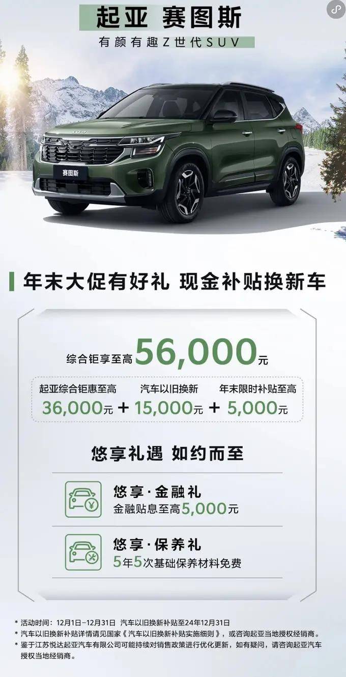 起亞賽圖斯官方售價(jià)10.99萬元起,綜合鉅惠至高3.6萬元,以舊換新補(bǔ)貼1.5萬元,年末顯示補(bǔ)貼至高0.5萬元。