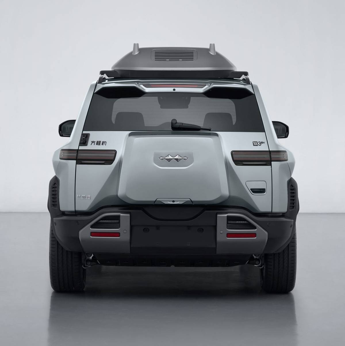 來到車尾,不出意外,鈦3配有僅供儲物的外掛小書包,兩側(cè)為橫向分體式尾燈,車頂配備高位剎車燈和雙段式擾流板,后包圍延續(xù)前臉的設計風格,繼續(xù)采用大面積熏黑飾板和灰色護板,滿滿的硬派越野范。雖然鈦3的外觀與家族的豹系列都是走硬派風,但鈦3并沒有延續(xù)豹5豹8的非承載式車身,而是采用承載式車身,屬于城市SUV類型。