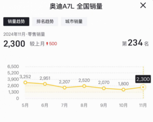所以,從這個層面來講,2024年11月份,奧迪A7L的單月銷量規模會升至2300臺,倒也值得肯定。