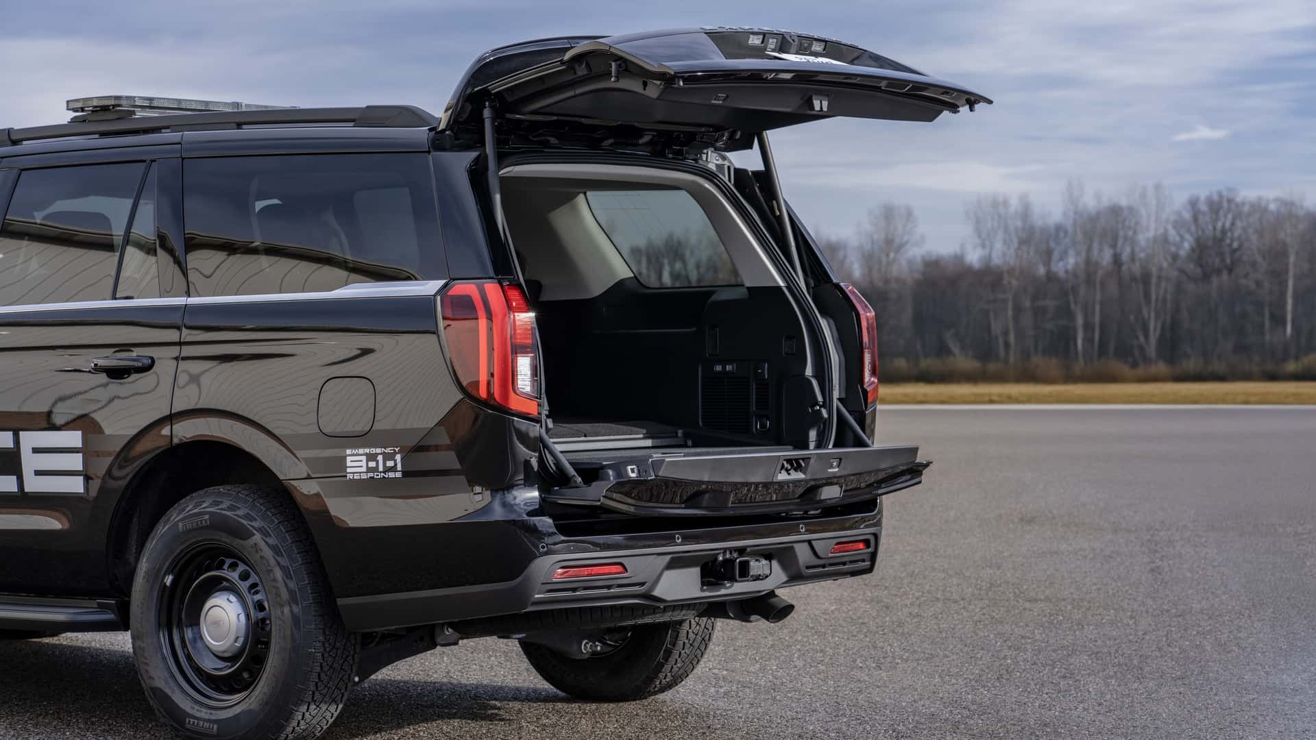 此外,Expedition SSV版本還配備了非常特別的安全模式,可以防止未經授權的人員進入車內。為了滿足夜間巡邏的需求,Expedition SSV還提供了一個選項,可以一鍵關閉車內所有的內部燈光,同時為了方便拿取后備箱的警用裝備,Expedition SSV版本后備箱采用了上下對開的模式,并具備相當的承重能力,同時該車也具備了7000磅拖拽能力,以滿足拖拽一些應急裝備。