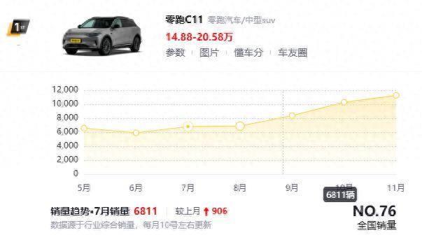 11月份零跑C11的銷(xiāo)量達(dá)到了11260輛,較上月增長(zhǎng)974輛,在15-20萬(wàn)元區(qū)間的新能源SUV中銷(xiāo)量?jī)H次于深藍(lán)S07,后者在11月售出12021輛。