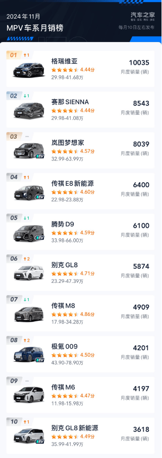 11月份MPV銷量排行榜前十名出爐,新能源MPV和燃油車MPV各占5席位,MPV市場的新能源MPV越來越多,小眾市場也不小眾了。