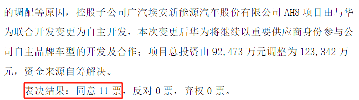 2023年3月27日,廣汽集團審議通過了《關于廣汽埃安AH8項目變更的議案》。同意由于各方資源的調配等原因,控股子公司廣汽埃安AH8項目由與華為聯合開發變更為自主開發,本次變更后華為將以重要供應商身份參與公司自主品牌車型的開發及合作。議案獲得11名董事全票通過。