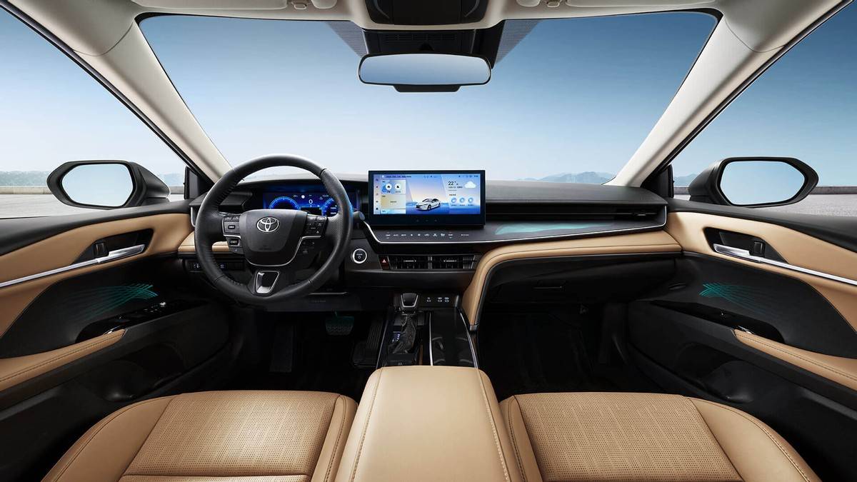 內飾方面,凱美瑞雙擎光輝版與現款在售車型保持一致,采用了T型非對稱式中控臺,搭配三幅式方向盤和懸浮式中控屏,雖然不及時下新能源車型的時尚新潮,但也比較耐看。配置上,新車配備了12.3英寸中控屏和12.3英寸液晶儀表,支持華為HiCar等手機互聯、語音控制、遠程控制等,功能偏向實用。
