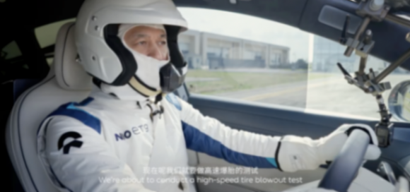更為罕見的是,李斌竟然還穿上了賽車服,駕駛著 ET9,分別以 150 km/h 和 160 km/h 的速度沖向了地釘,來驗證發生爆胎后 ET9 可以做到「毫秒級響應,厘米級偏航」的安全能力。