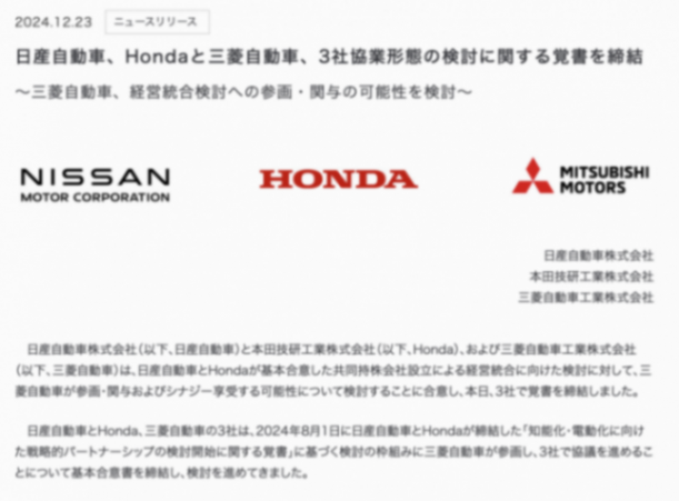 同時,三菱也以及明確加入此次合并協議,三家公司已經在當地時間12月23日17:00聯合召開新聞發布會,但關于合并的更多詳情尚未進行公布。