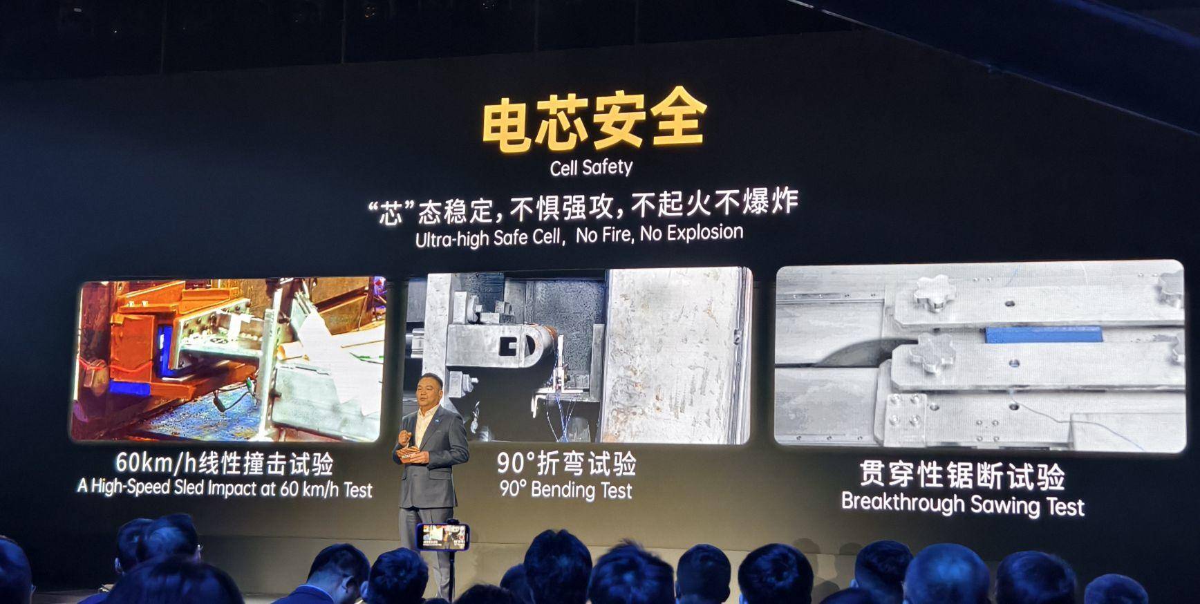 值得一提的是,磐石底盤的電芯本體歷經(jīng)60公里時速滑車撞擊、90°折彎、暴力鋸斷破壞橫截面直接裸露等三大超嚴苛測試,依然不起火、不爆炸。
