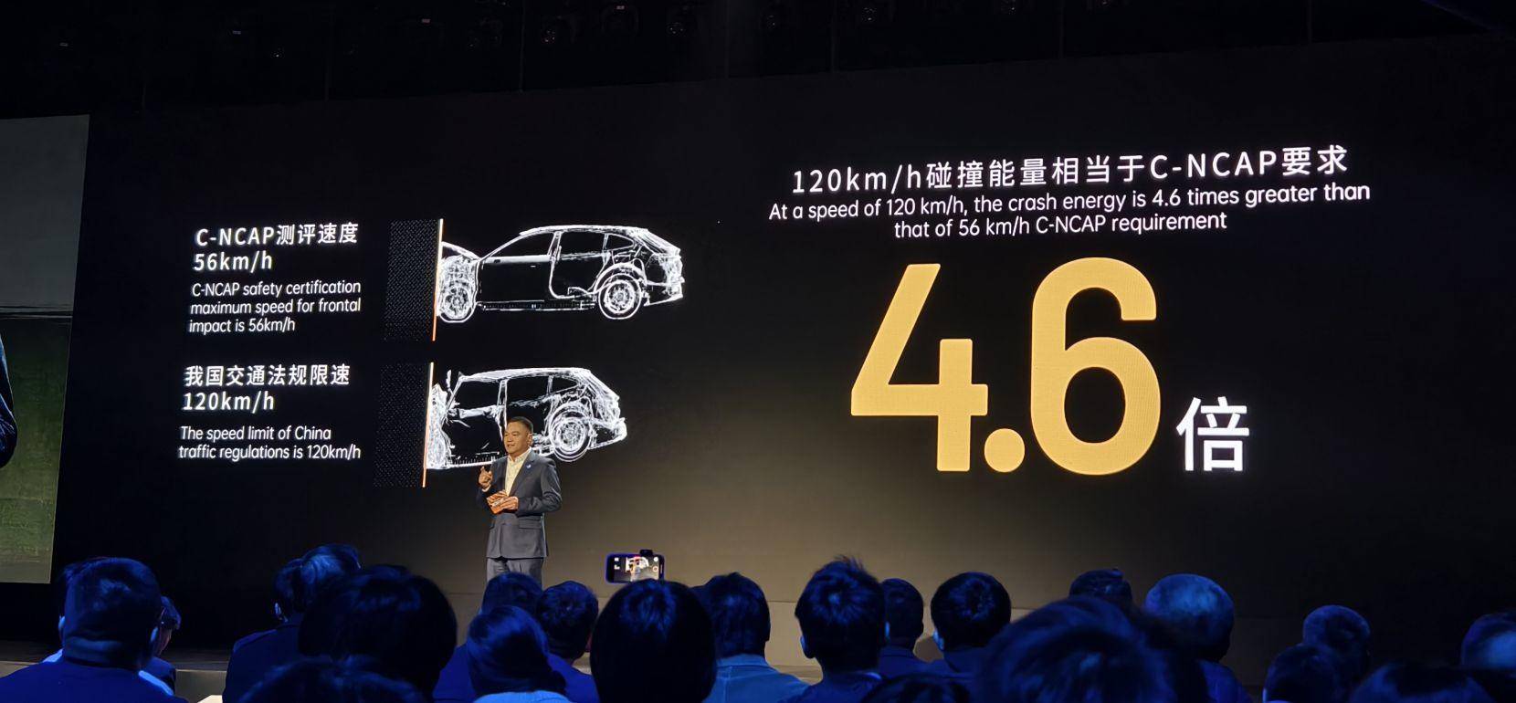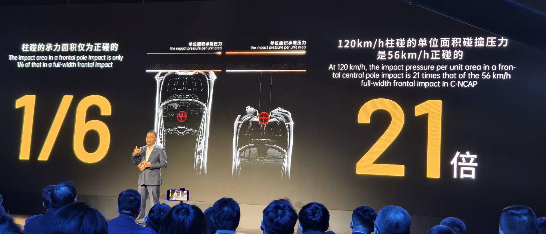 在更嚴苛的中心柱碰測試(模擬與電線桿、大樹、動物等非標準物品碰撞)下,其承力面積僅為正面碰撞的1/6,碰撞壓力更是成倍增長。120km時速下,中心柱碰時底盤單位面積碰撞壓力飆升至C-NCAP評測中56km/h全寬正碰工況的21倍。
