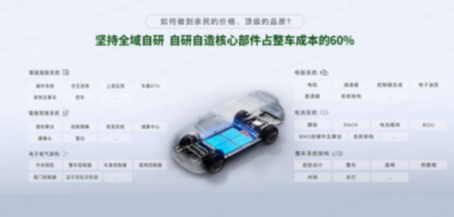 零跑也學(xué)到了當(dāng)下新能源“扛把子”比亞迪的精髓——比亞迪造車,率先掀起“油電同價”的狂潮,靠的就是垂直整合,堅守自研。零跑目前已經(jīng)實(shí)現(xiàn)整車成本70%的自研自造能力。除電芯、內(nèi)外飾外購,底盤、汽車電子電器為自研+外包生產(chǎn)外,其它所有零部件均為自研自產(chǎn),成為現(xiàn)在國內(nèi)造車新勢力中具備全域自研能力且垂直整合度最高的智能電動車企。