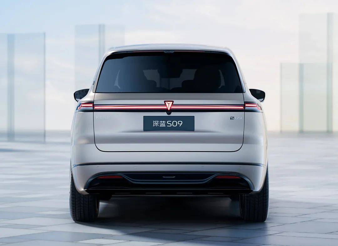 深藍S09車身側面配備有隱藏式車門把手,并在前翼子板位置加入側后向攝像頭,在D柱和車門下邊緣使用黑色裝飾條。值得注意的是,該車還提供有較大尺寸亮面輪輞以及多輻輪輞。車尾部分,深藍S09配備有貫穿式LED尾燈,尾燈兩側具有分段式點亮效果,車尾底部帶有黑色包圍。車身尺寸方面,深藍S09的長寬高為5205/1996/1800mm,軸距為3105mm。與在售理想L9(長寬高5218/1998/1800毫米,軸距3105毫米)尺寸接近,并采用6座布局設計。