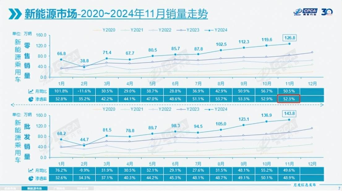 新能源汽車行業也是如此。根據乘聯會數據,在2024年11月,新能源汽車的滲透率已經高達52.3%,不僅遠超去年同期的39.8%,還在份額上擊敗了燃油車,成為新的市場主流。