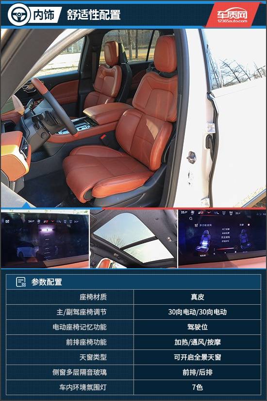 舒適性方面向來是林肯品牌的拿手好戲,前排座椅擁有30向電動可調,就連腿托都可以進行左右單獨調節(jié)。功能方面,前排和第二排座椅均提供加熱和通風功能,前排還擁有多部位的座椅按摩功能,舒適性直接拉滿。另外,頭頂上方還配備了面積較大的可開啟全景天窗,能夠為后排乘客帶來不錯的開陽感。