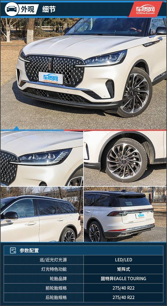 輪胎方面,評測車配備了多條輻輪轂,造型比較時尚。尺寸選用的是275/40 R22輪胎規(guī)格,與整車比例十分協(xié)調。輪胎品牌為固特異EAGLE TOURING,是一款主打靜音性和耐磨性的輪胎。