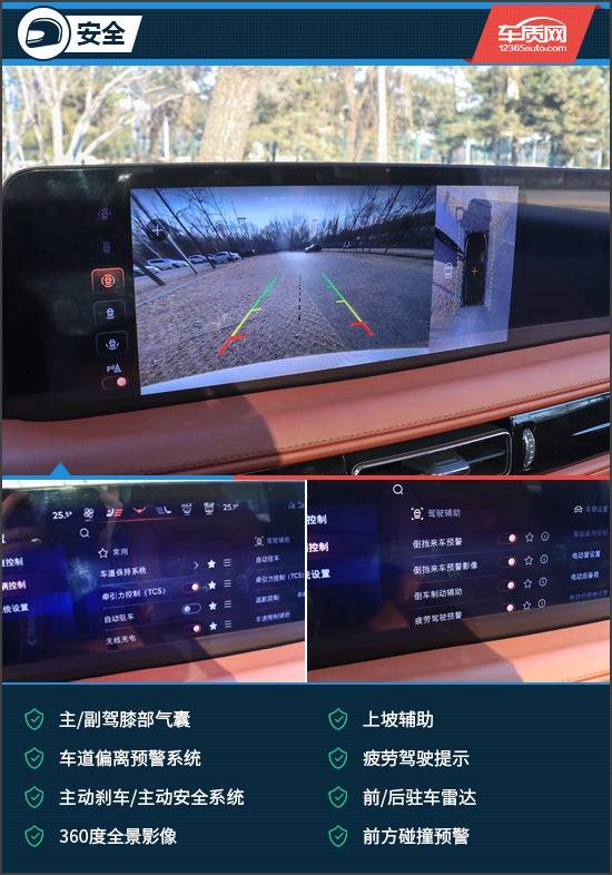 安全方面,評測車可謂全副武裝,像上坡輔助、車道偏離預警系統(tǒng)、疲勞駕駛提示、主動剎車/主動安全系統(tǒng)等均有所配備。同時,評測車還配備了同級罕見的主/副駕膝部氣囊。另外,360度全景影像實測畫質較為清晰,并配有隨動轉向的駐車輔助線,能夠進一步幫助駕駛者更好地完成駐車。