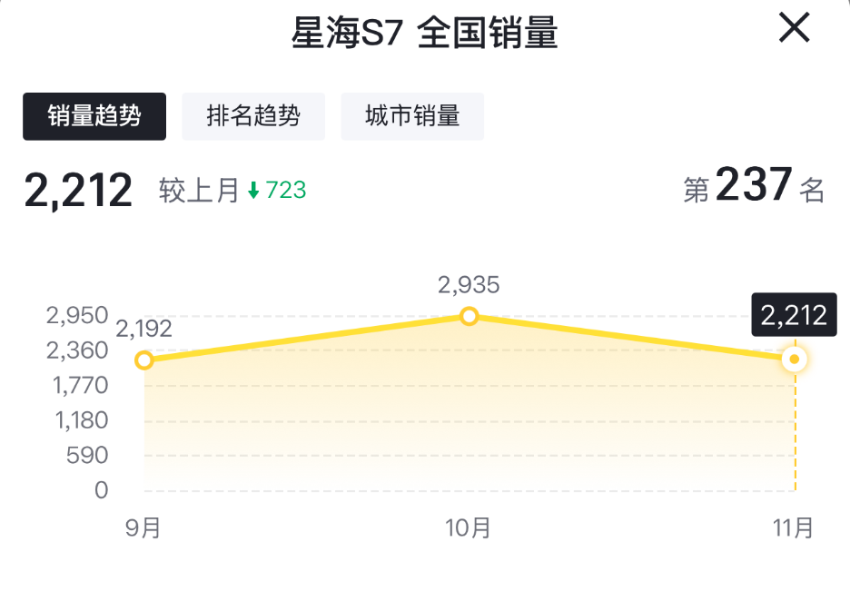 從這些層面來看,星海S7具備一戰的實力。然而,讓人想不到的是,11月其銷量反而逆勢環比下滑了。