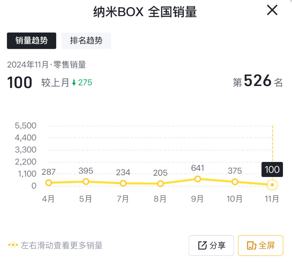 相比上個月,其銷量下滑了73.33%。顯然,2024年11月份,納米BOX的單月零售銷量降幅高達7成以上。