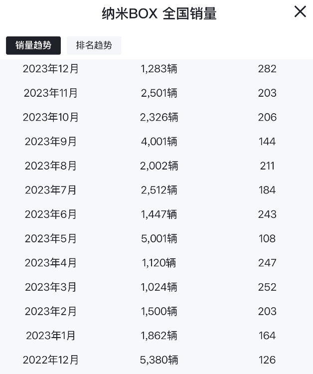 但是,遺憾的是,進入2024年之后,從1-11月份銷量表現來看,納米BOX的表現與此前有了一定差距。