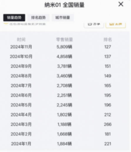 但是,如今納米01在國內車市的單月零售銷量已經直逼6000臺。行業綜合銷量數據顯示,2024年11月份,納米01的單月零售銷量為5809臺。