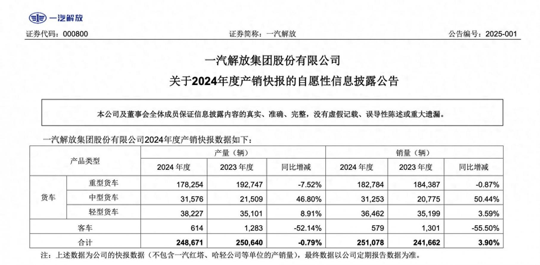 1月12日,一汽解放(000800)披露2024年度產銷快報。公告顯示,公司2024年累計銷售商用車25.11萬輛,同比增長3.90%。